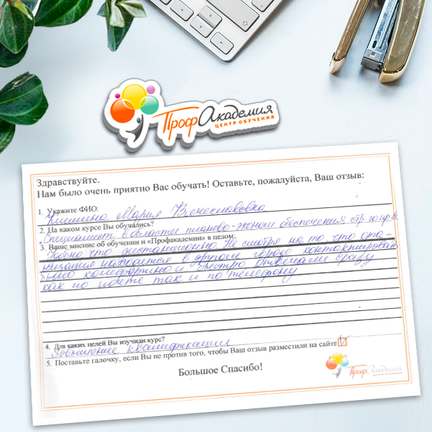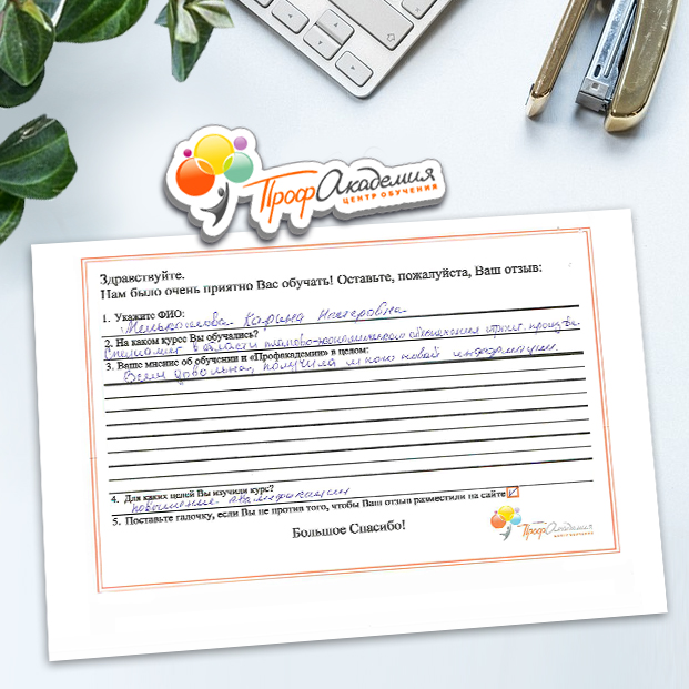 Обучение очень понравилось. Удобный формат, доступная и очень понятная программа обучения. Я приобрела для себя необходимые знания и навыки легко и быстро. Организацию обучения, оформления и пересылок тоже хочу отметить. Молодцы! Все быстро, четко и очень удобно. Спасибо!